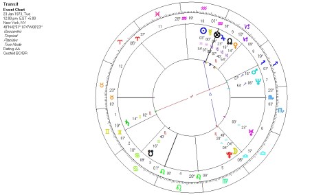 This death was the first of many in her family concluding with the death of her father on March 15, 1975. On this day Saturn was at 11 Cancer in opposition to the Sun’s antiscia point of 10 Capricorn and Jupiter was at 29 Pisces transiting the antiscia point of her natal Saturn, ruler of her MC. As well the North Node at 3 Sagittarius right on Mars’s antiscia point. In her progressed chart the Moon had reached the antiscia of her natal Moon whilst the ASC was within one minute of her progressed Uranus’s and 1 degree of her natal Uranus’s antiscia point. This last detail speaks volumes about the final blow her father’s death must have been to Christina, now she was truly alone and abandoned in the world by her family.