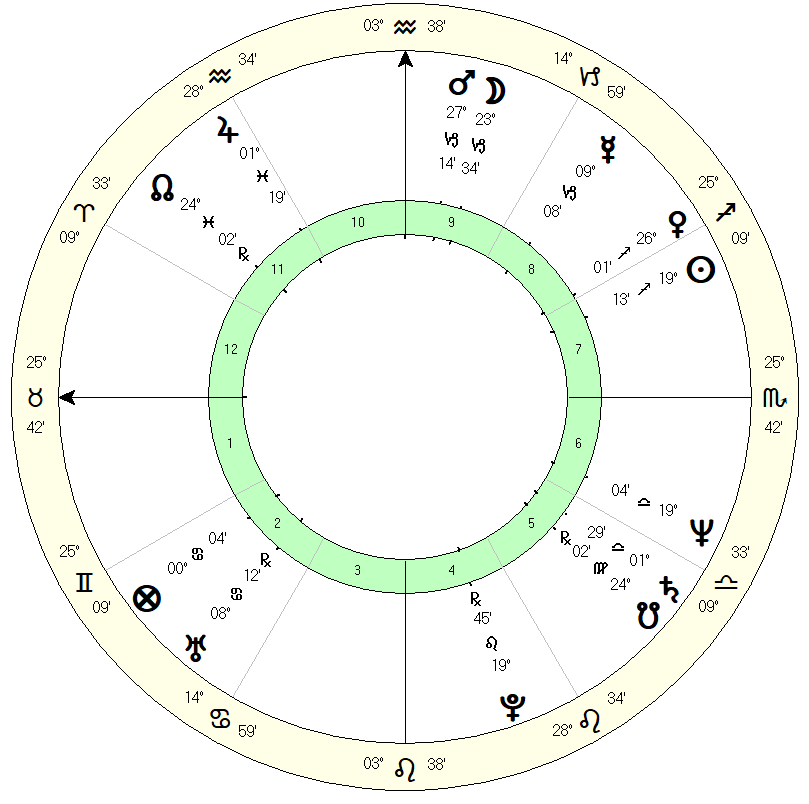 Venus is also the ‘significator of the mind’9 in this chart. The significator of the mind does not denote intelligence but rather the manner in which one uses their mind and to what end. As such, she does not herald a positive use of his mind. She is essentially debilitated, being both in fall and peregrine. She is unaspected, except for her separating sextile with Pluto. Being located on the IC, the root of the chart, Venus had a lot of influence over the life. And here we find an enigma.