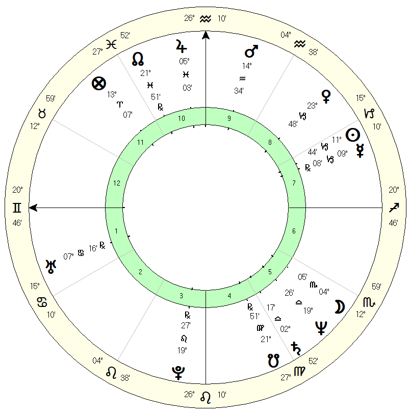Almost everything is under the horizon, indicating that there is much that is hidden beneath the surface. What you see is not necessarily what you get. It is worth noting that both benefics are in essential debility, while the two malefics: Mars and Saturn are in their signs of rulership. Located on the IC, the root of the chart, the essentially debilitated Venus has a lot of influence over the life.
