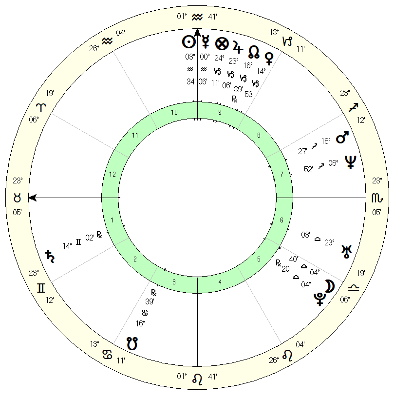 There is an abundance of Air in this chart, with both luminaries, Jupiter, Saturn, the South Node and IC in Air signs. The hot, moist element of Air indicates a sanguine temperament, being of a friendly and social nature. Air is associated with intellect, ideas, communication and social interchange. Unless balanced by the cold, dry Earth element, Air can tend towards shallowness and an avoidance of deep contemplation. Earth with its natural inclination to stillness, depth, scholarship and tangible reality, will ground the idealised, hypothetical and intellectualised reality of Air. In this chart there is very little Earth; with only Venus in Virgo and Uranus/Neptune conjunct the Capricorn DES; the angle representing the other and the open enemy.