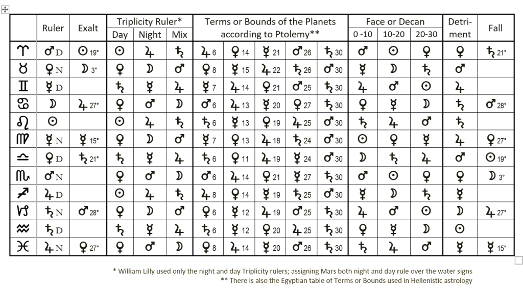 In traditional astrology the essential and accidental dignity of a planet is very important: The condition of a planet dictated how well it could function and do its job. Essential dignity was based on a   planet’s position in the zodiac and there were five: rulership, exaltation, triplicity, terms and face or decans.   The accidental condition of the planet was based on its relationship to the Sun and Earth included: house   position relative to the angles, aspect, speed and direction.