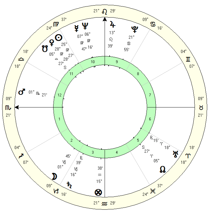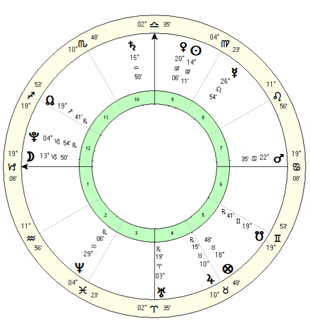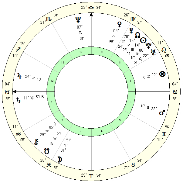 His Lord of the Ascendant is Saturn in Leo in the 10th house. The planet signifying his Quality of Mind  is Mars in Taurus in the 7th house with Saturn in Leo a close contender. Finally the Pilot of the Soul is Venus in Taurus in the 7th conjunct Mars.