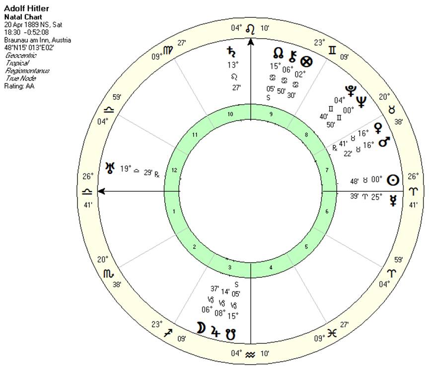 We can not judge a chart in a vacuum. Hitler’ fate was linked to the circumstances of his era, culture, nation and birth. Hitler did not act alone in perpetrating the evil that was the Third Reich. Yet as the figure head for this movement he became the focal point of its manifestation. Was Hitler an evil man? The answer is that he was a weak man who through fateful circumstances yielded a huge amount of worldly power (symbolized by his celestially weak planets in terrestrially strong placement). What could have been done with this power need not have been so destructive, but it takes a strong individual to resist the allure of the ego.