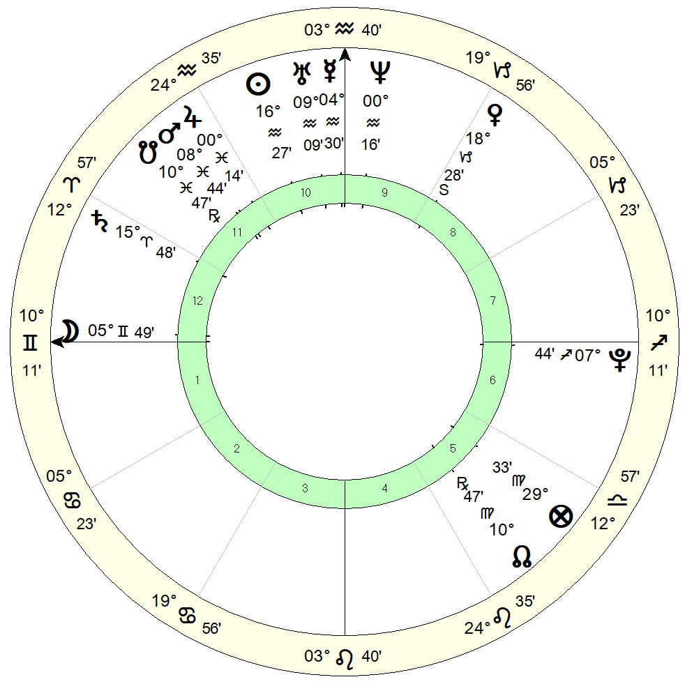 I could not get beyond the fact that the Moon would first hit Pluto before he could complete his sextile to Venus; which I interpreted as a prohibition. (This chart adds to my growing understanding that the outer planets do not function in the same manner as the seven classical planets do).