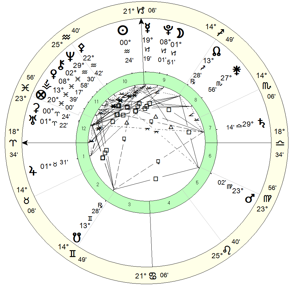 In blissful ignorance I continued analyzing the chart. Scorpio was rising; its ruler Mars was in the 12th house in Libra, between Saturn and the Moon. Mars was in a separating trine with Jupiter, sextile with Mercury and moving towards a trine with Venus. Both Venus and Jupiter were in Gemini and the 8th house. In fact Mars was in a partile trine to the cusp of the 8th.