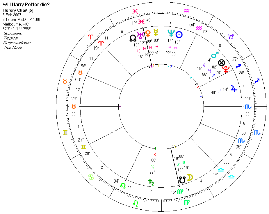 So what happened when the screen went black? Did Tony Soprano live or die? The evidence gained from the receptions in this chart point to Tony’s survival. Lord of death, Sun receives Saturn/Tony into his domain. The “Tony Soprano clause” works in Tony’s favour here death can do him no harm. Yet he is under the Sun’s power in the sign of his detriment and in the house indicating anguish of the mind. We can conclude that Saturn/Tony will not be free of the fear of death, but for the moment death, the Sun can not harm him.
