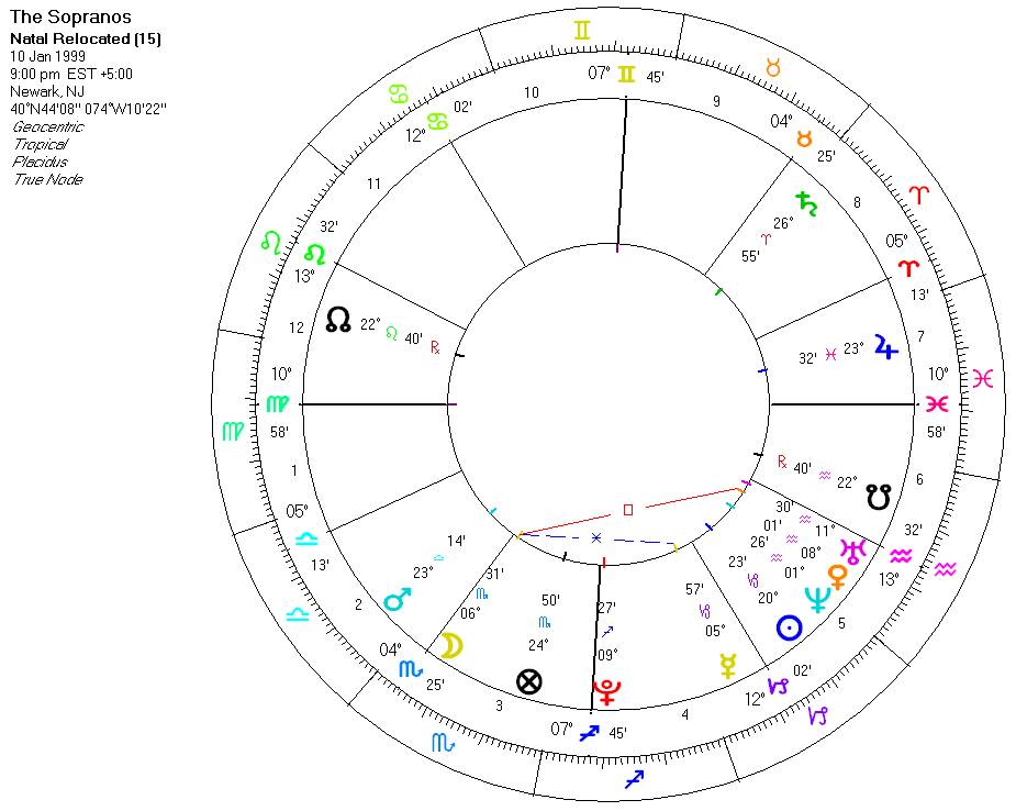 Before continuing my imaginary casting I decided to have a look at the chart for January 10, 1999 at 9:00 pm the date and time the series’ first aired in America. I set the chart for Newark, New Jersey, the geographical setting for the show. The resulting chart is an interesting study of receptions and a great example of how obliging astrology can be in providing us with the perfect chart for every occasion. As the cast of characters naturally found their assigned planet, led by Tony Soprano, the previously hypothesised Saturn in Aries, I was left in awe at the synchronistic revelation that is astrology.