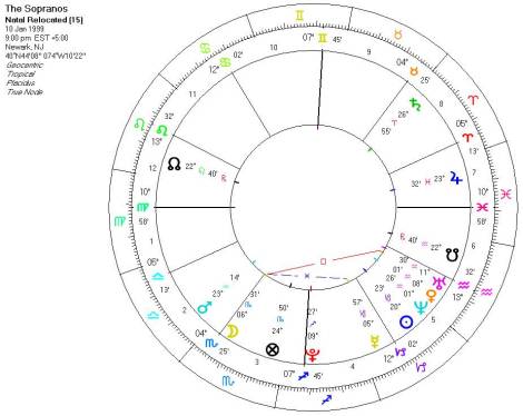 The Moon/Carmela is trining Saturn/Tony from Saturn’s original position, indicating that Carmela has come to understand and accept Tony. Her position on the IC represents the conclusion of the show that family is the true foundation of life. The Moon in Aries, is received by Mars from whom she is separating, indicating that she has access to his virtues, including self-assertion and courage. By the end of the show Carmela has gone from an obedient and subservient wife totally dependent on her husband, to one who accepts the life and man she has chosen, takes financial responsibility and sits more as an equal partner with Tony. {Interestingly the Moon is on the antiscia point of the premier charts Mercury/Tony’s criminal colleagues}.