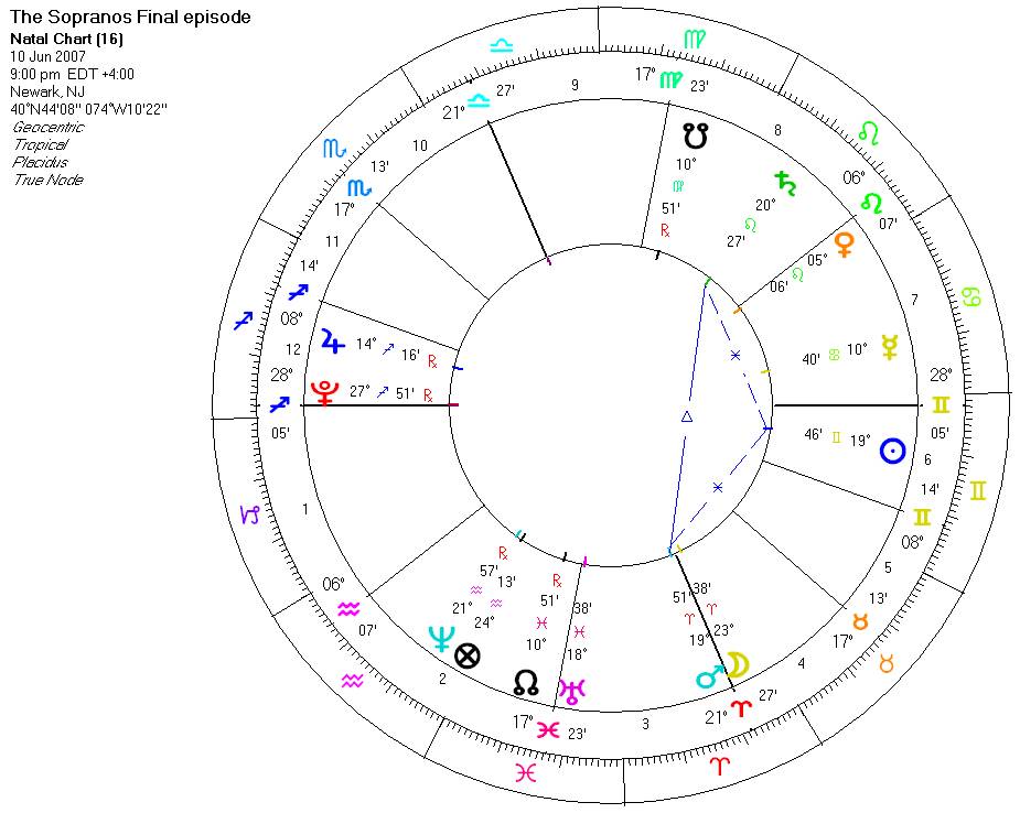 So what does lie ahead for Tony Soprano and his follow cast? The final episode “Made in America” aired on June 10, 2007 at 9:00 pm. The chart for this event again set in Newark NJ compares interestingly with the chart of the show’s premier. Mars, Venus and Mercury have all moved to oppose their premier chart’s position, the South node is conjunct the premier chart’s ASC almost to the minute and the Moon is conjunct Saturn’s premier position.