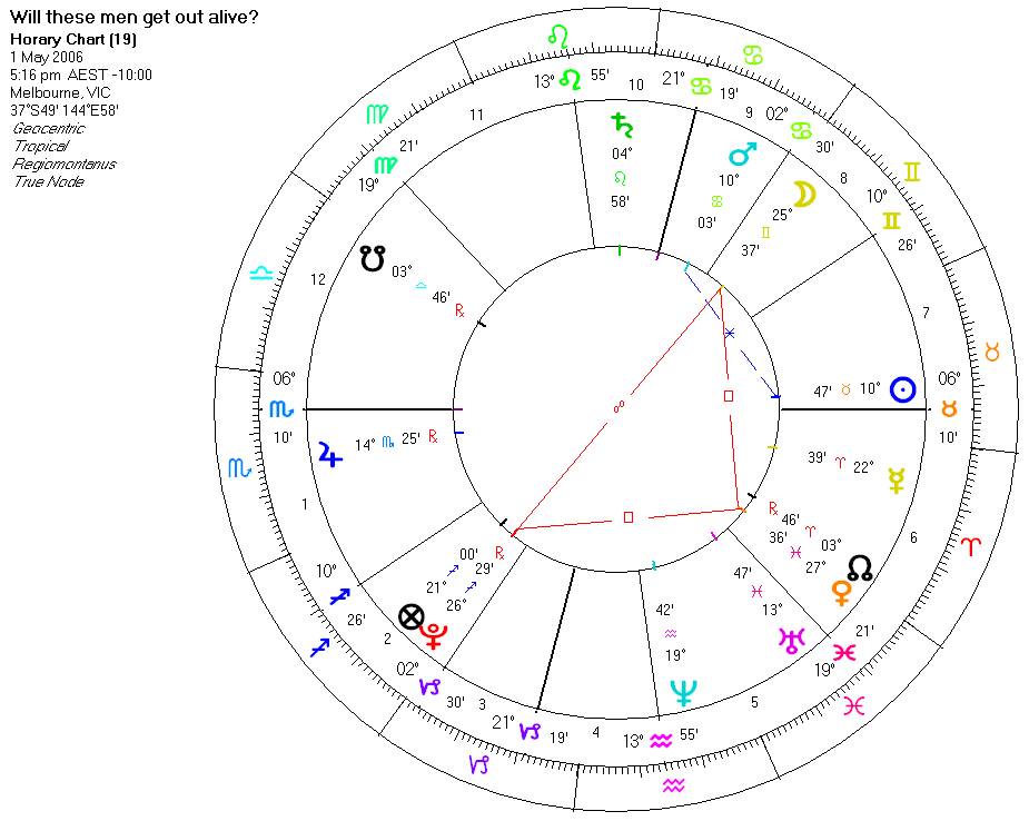 There are some final points of interest in this chart, like Pluto, Lord of the underworld sitting on the IC underpinning the chart. The twelfth house associated with criminals and secret enemies is ruled by the Sun that is on the antiscia point of Pluto. The two malefics, Mars and Saturn are in the signs of their detriment or fall, accentuating their malevolence and allowing them to act in an extreme manner. Both unfortunately placed, they oppose each other from the house of death and the house known as “the gates of hell”.